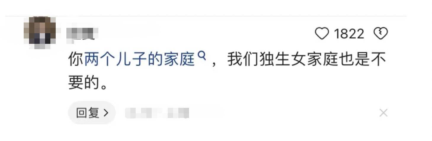 不过对此,很多独生女父母都不买账,其中一位网友的回复甚至引发上千网友点赞:“你两个儿子的家庭,我们独生女家庭也是不要的。”